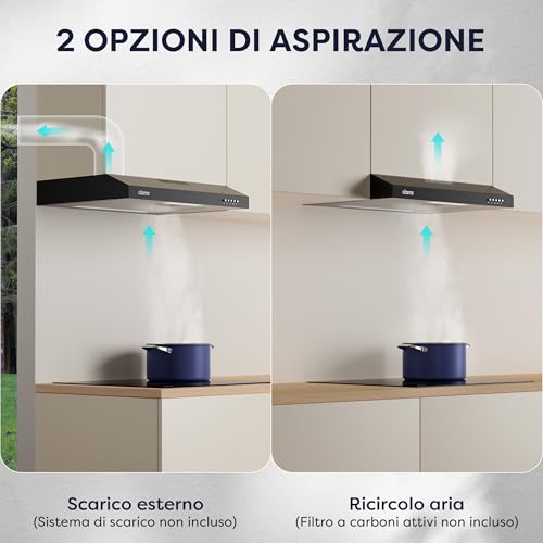 Uno dei vantaggi principali di questa cappa CIARRA è la sua doppia modalità di installazione. Può funzionare sia in modalità aspirante, espellendo fumi e vapori all'esterno dell'abitazione tramite un tubo di scarico, sia in modalità filtrante (o a ricircolo). Quest'ultima opzione è una vera manna dal cielo per chi vive in appartamento o non ha la possibilità di creare uno sfiato esterno.