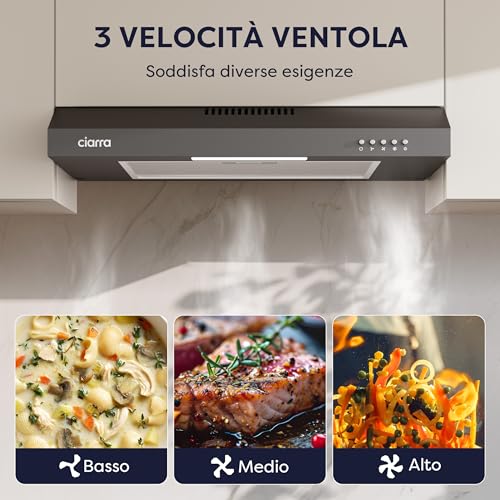 Veniamo al dunque: come se la cava la cappa CIARRA nell'uso di tutti i giorni? I modelli da 60 cm di questo brand sono generalmente equipaggiati con motori che offrono tre livelli di velocità, permettendo di adattare la potenza di aspirazione in base alla cottura in corso. Per una semplice pasta in bianco, la prima velocità è più che sufficiente, mentre per fritture o cotture che generano molto vapore, è necessario passare alla massima potenza.