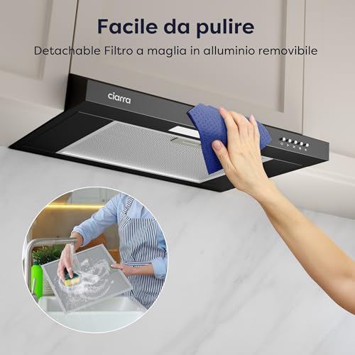 L'installazione della cappa sottopensile CIARRA è relativamente semplice, soprattutto per chi ha un minimo di dimestichezza con il fai-da-te. Il manuale di istruzioni incluso guida passo dopo passo nel montaggio. La manutenzione ordinaria è altrettanto agevole. Il componente principale da tenere pulito è il filtro antigrasso in alluminio. Questo filtro a rete metallica ha il compito di intrappolare le particelle di grasso sospese nell'aria, evitando che si depositino all'interno del motore. Fortunatamente, è facilmente rimovibile e può essere lavato a mano con acqua calda e sapone o, ancora più comodamente, direttamente in lavastoviglie. Una pulizia regolare, almeno una volta al mese, è cruciale per mantenere le prestazioni della cappa e prevenire rischi.