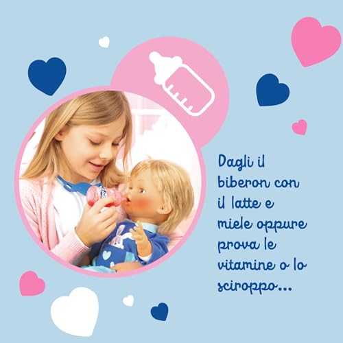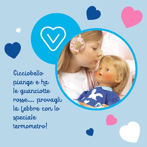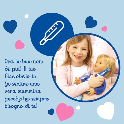 - Le coccole: Naturalmente, nessuna cura è completa senza una buona dose di coccole. Il ciuccio, incluso nella confezione, è fondamentale per calmare il pianto di Cicciobello e farlo addormentare serenamente.