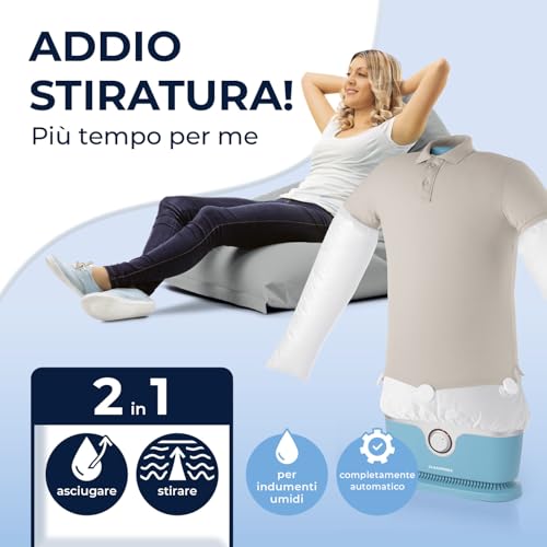 A questo punto, si accende l'apparecchio e si imposta il timer, solitamente tra i 5 e i 15 minuti a seconda del tessuto e del grado di umidità. Il manichino si gonfia, riempiendo la camicia, e un motore interno genera un flusso d'aria calda che asciuga il tessuto e, grazie alla tensione creata dal pallone gonfio, elimina la maggior parte delle pieghe. Il processo è completamente automatico: una volta avviato, non è richiesta alcuna supervisione.