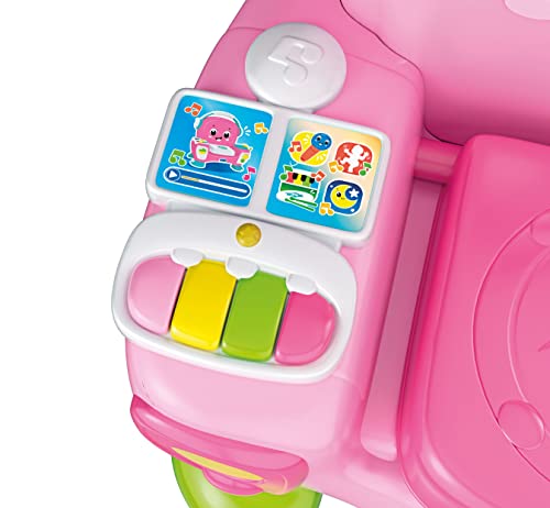 - Modalità "Suona": Sul bracciolo destro è integrata una piccola pianola con tasti colorati. Questa funzione guida il bambino alla scoperta delle note musicali associandole ai colori, un primo approccio semplice e intuitivo al mondo della musica.