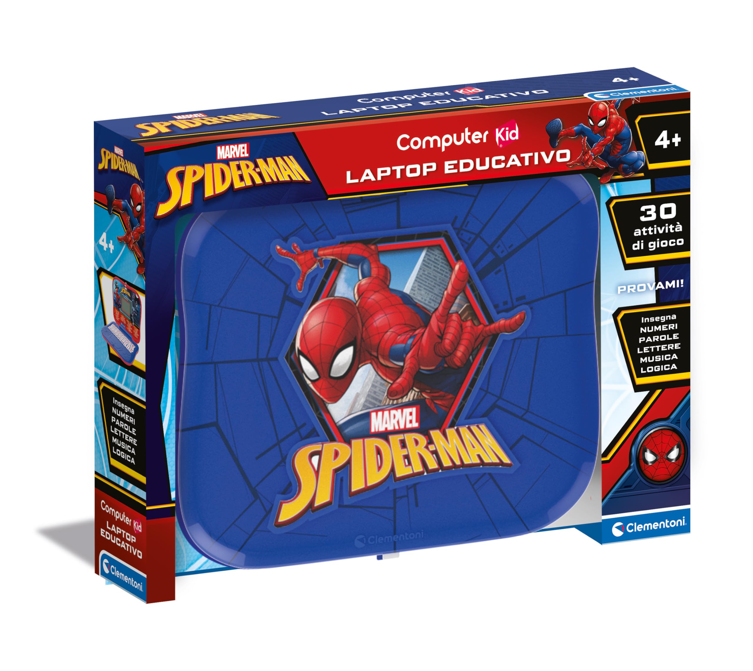 Appena aperta la confezione, il Computer Kid Spiderman di Clementoni colpisce subito per il suo design accattivante. I colori sono quelli classici dell'Uomo Ragno, rosso e blu, e sulla scocca campeggia un'immagine del supereroe in azione, con tanto di dettagli a rilievo che simulano una ragnatela. È un dettaglio che i piccoli fan Marvel apprezzeranno sicuramente. La struttura è interamente in plastica, ma appare solida e ben assemblata, pensata per resistere all'uso, a volte poco delicato, dei bambini. Le dimensioni sono compatte e il peso è contenuto, rendendolo facilmente trasportabile. All'interno della scatola troviamo il laptop e le 3 batterie AA/LR06 già incluse, un'ottima notizia perché si può iniziare a giocare fin da subito.