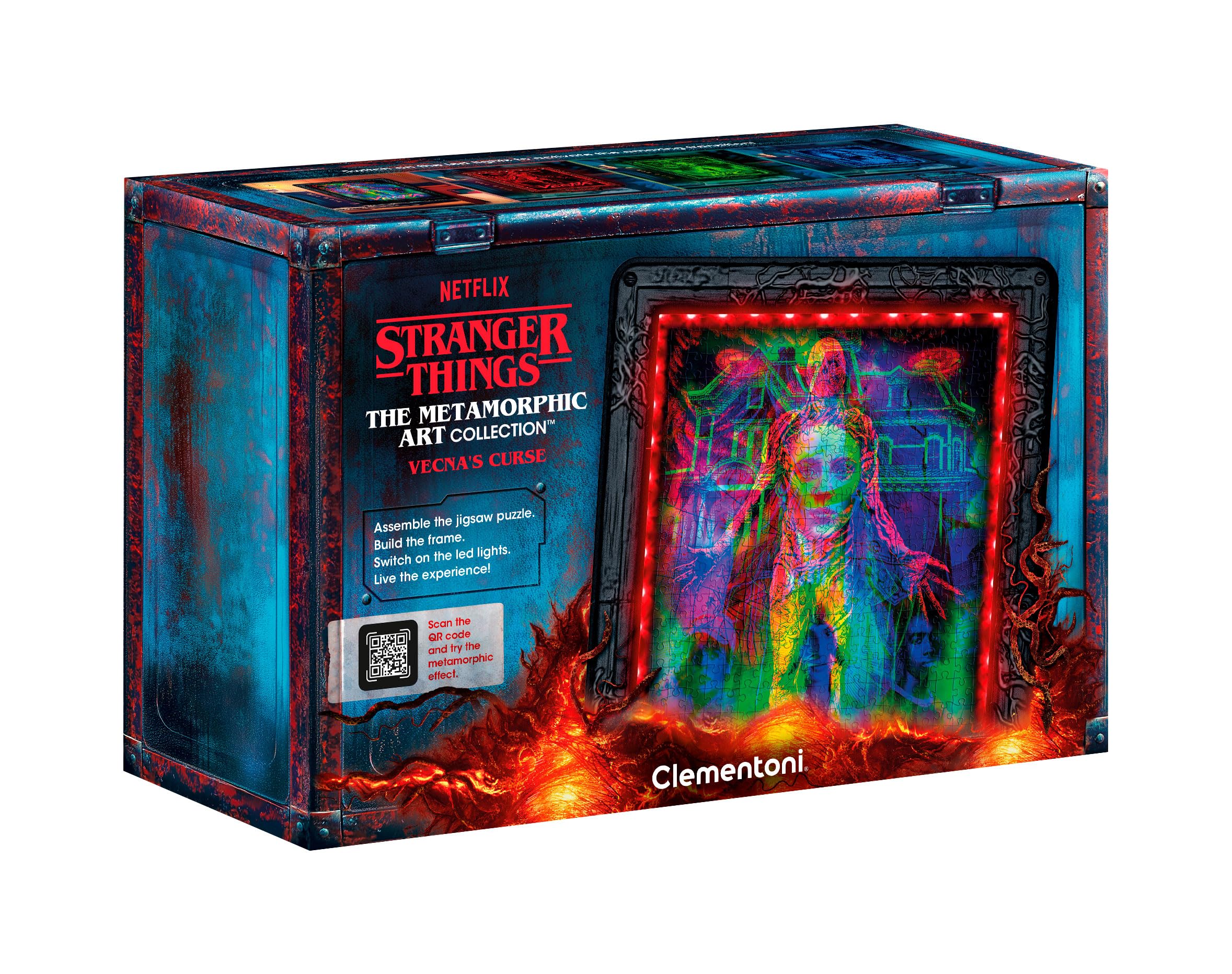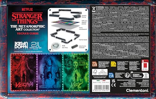 Diciamolo subito: questo non è il solito puzzle. La linea Clementoni Stranger Things Metamorphic Art è un'esperienza che unisce il piacere del classico gioco da tavolo con il design e la tecnologia. Si tratta di un prodotto ibrido: prima componi un puzzle da 520 pezzi, poi lo incolli, lo inserisci in una cornice inclusa e lo arricchisci con una striscia di luci LED RGB. È qui che avviene la magia. Grazie a una speciale tecnica di stampa, l'immagine che vedi alla luce del giorno si trasforma, rivelando scene nascoste quando viene illuminata dai LED. Ogni colore (rosso, blu e verde) svela un'illustrazione diversa, creando un effetto dinamico e decisamente suggestivo.