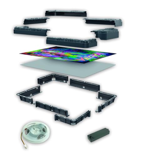 Una volta completato il puzzle (le dimensioni finali sono di circa 49x36 cm), inizia la seconda fase, quella più "creativa". Bisogna applicare la colla in modo uniforme su tutta la superficie per rendere l'opera solidale. Successivamente, si passa al montaggio della cornice in plastica e all'applicazione della striscia LED adesiva lungo il bordo interno. Questa parte del processo richiede un po' di manualità e attenzione. Le istruzioni sono chiare, ma è bene procedere con calma per assicurarsi che tutto sia allineato correttamente.