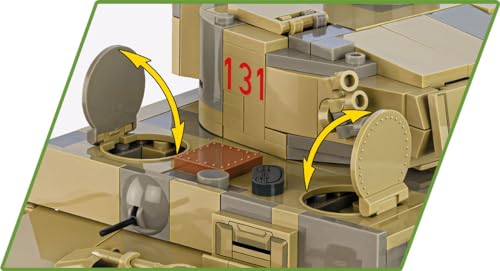 Il Cobi 2588 non è solo bello da vedere, ma è anche ricco di elementi mobili che ne aumentano la giocabilità e il realismo. La torretta è completamente girevole e il cannone può essere alzato e abbassato. I cingoli, composti da singoli link, sono funzionanti e permettono al carro armato di muoversi su diverse superfici, un dettaglio tecnico non scontato in modelli di questo tipo. Inoltre, i portelli si aprono, rivelando un interno sorprendentemente dettagliato, con spazio per inserire munizioni (incluse nel set) e le figure Cobi (non incluse).