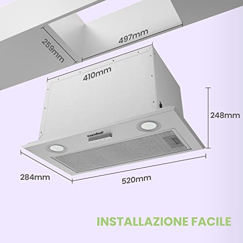 La prima cosa che salta all'occhio della cappa aspirante COMFEE' da 52 cm è il suo design compatto e integrato. Pensata per essere installata sotto un pensile, questa cappa scompare quasi completamente alla vista, mantenendo un aspetto pulito e ordinato, ideale per le cucine moderne o per chi ha problemi di spazio. Realizzata in acciaio inossidabile, si adatta con discrezione a diversi stili di arredamento, offrendo un tocco di modernità senza essere invadente.