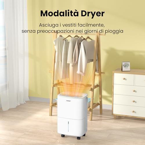 Una delle caratteristiche che ho apprezzato di più è la presenza di diverse modalità operative. Oltre alla modalità normale, dove si può impostare liberamente la percentuale di umidità desiderata (tra il 35% e l'85%), c'è una modalità "continua" che fa lavorare l'apparecchio senza sosta fino al riempimento della tanica. Alcuni modelli simili offrono anche una modalità "Dryer" (asciugatura), perfetta per accelerare l'asciugatura del bucato in inverno.