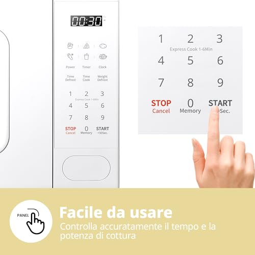 Oltre alla cottura manuale, il COMFEE' CM-E202CC offre 6 menù preimpostati per le preparazioni più comuni come popcorn, pizza, patate, bevande e altro. Questi programmi automatici si sono rivelati abbastanza precisi nei nostri test, semplificando la vita a chi non ha tempo o voglia di impostare manualmente potenza e tempo. Molto apprezzata è anche la funzione "Express Cook", che avvia il microonde alla massima potenza per 30 secondi con la semplice pressione di un tasto, incrementabili ad ogni pressione successiva. È la funzione perfetta per scaldare rapidamente una tazza di latte o un caffè.
