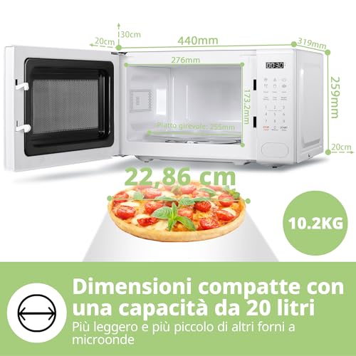 All'interno, troviamo un classico piatto girevole in vetro da 25,5 cm, sufficientemente ampio per la maggior parte dei piatti piani e delle ciotole standard. La capacità interna è di 20 litri, uno standard per questa fascia di prodotto, perfetta per single, coppie o piccole famiglie. La luce interna, di una tonalità gialla, illumina a sufficienza il vano cottura per monitorare i cibi durante il funzionamento.
