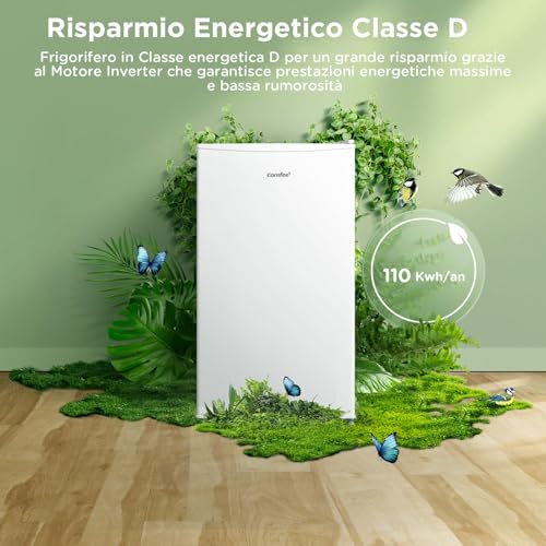 Grazie al compressore Inverter, il COMFEE' RCD80 si posiziona in classe di efficienza energetica D (secondo la nuova etichettatura), con un consumo annuo stimato di circa 110 kWh. Un valore decisamente buono che permette di contenere i costi in bolletta, aspetto non trascurabile per un elettrodomestico sempre in funzione. Questo frigorifero è la scelta ideale per single, coppie, studenti o per chiunque necessiti di una soluzione di refrigerazione compatta e performante. Non è invece adatto a nuclei familiari numerosi o a chi fa grandi scorte di spesa, data la capacità limitata.