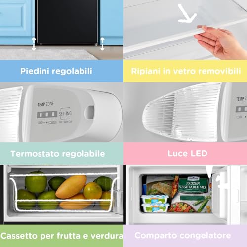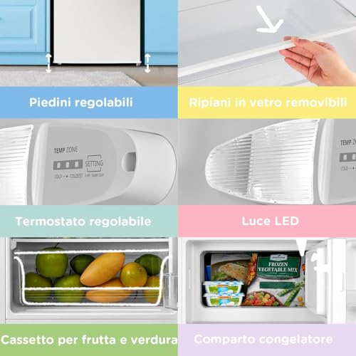 All'interno, gli 80 litri di volume sono suddivisi in modo intelligente per massimizzare la capienza. Lo scomparto frigorifero ha un volume di 68 litri, mentre la parte superiore ospita un vano congelatore da 12 litri con certificazione 4 stelle, in grado di raggiungere i -18°C e di conservare alimenti surgelati per lunghi periodi. Questo piccolo freezer può congelare fino a 2 kg di cibo in 24 ore.