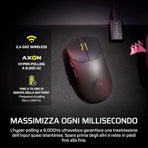 La connettività è un altro punto interessante. Il SABRE v2 PRO funziona in modalità wireless a 2.4GHz tramite un dongle USB-C o in modalità cablata con il cavo USB-C incluso. Corsair ha scelto di eliminare il Bluetooth, una decisione mirata a ridurre il peso e a garantire sempre le massime prestazioni, dato che il Bluetooth non sarebbe all'altezza del gaming competitivo.