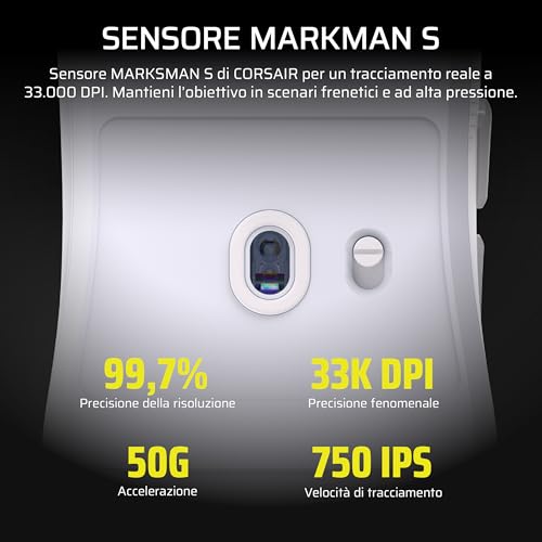 Sotto la scocca minimalista si nasconde una tecnologia da vero top di gamma. Il cuore pulsante è il sensore ottico Corsair MARKSMAN S, capace di raggiungere i 33.000 DPI, con una velocità di tracciamento di 750 IPS e un'accelerazione di 50G. Questi numeri si traducono in una precisione di tracciamento praticamente impeccabile, anche nei movimenti più rapidi e concitati tipici dei giochi FPS competitivi. La mira risulta stabile, precisa e senza incertezze.