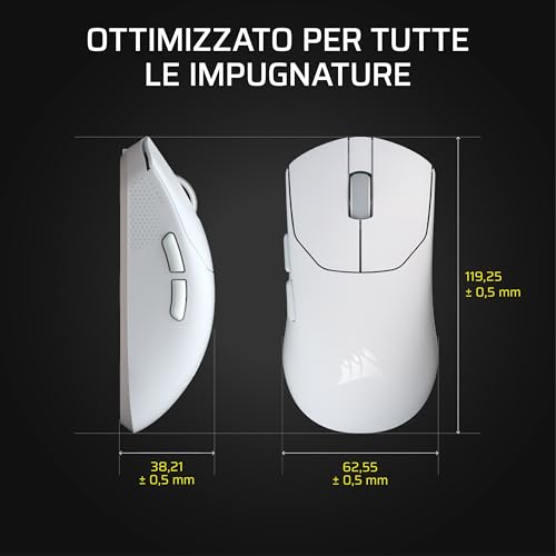 La prima cosa che colpisce del Corsair SABRE v2 PRO è, senza ombra di dubbio, il suo peso: appena 36 grammi. È una cifra quasi incredibile, che lo posiziona tra i mouse più leggeri in assoluto sul mercato. La vera magia, però, sta nel fatto che Corsair ha raggiunto questo risultato senza ricorrere a scocche forate o "a nido d'ape", che spesso possono compromettere la robustezza e accumulare polvere. Il SABRE v2 PRO ha un corpo solido, disponibile nelle colorazioni bianco o nero, che al tatto risulta robusto e ben assemblato, senza scricchiolii o flessioni preoccupanti.