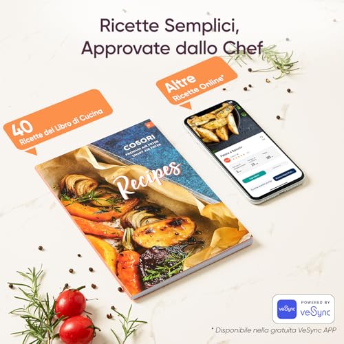 È importante notare che del modello da 5,5 litri esistono diverse varianti. Oltre ai diversi colori (nero, rosso, bianco, grigio, blu), è disponibile anche una versione "Smart" (modello CS158-AF) che si collega tramite Wi-Fi all'app VeSync. Questa app permette di controllare la friggitrice da remoto, accedere a ricette online e ricevere notifiche sul proprio smartphone. La confezione include solitamente un ricettario con numerose ricette in italiano (fino a 100 a seconda della versione) e, in alcuni casi, accessori come una griglia metallica e degli spiedini.