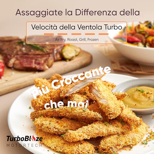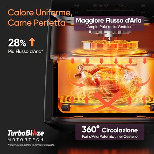 Ma veniamo al cuore pulsante di questo apparecchio: la tecnologia TurboBlaze. Il segreto sta in un nuovo motore a corrente continua (DC) che, a parità di potenza (1725W), risulta più efficiente e permette di avere una ventola a 5 velocità diverse. Questa non è una caratteristica comune in altre friggitrici ad aria e fa una differenza enorme.