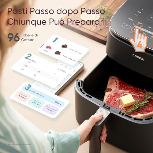 È importante notare che, a differenza di altri modelli COSORI, la Turbo Blaze non è una friggitrice "smart". Non ha connettività Wi-Fi, quindi non può essere controllata da remoto tramite l'app VeSync. L'app serve comunque per accedere a un vastissimo ricettario digitale con oltre 100 ricette, che si aggiunge al pratico libro di ricette cartaceo incluso nella confezione.