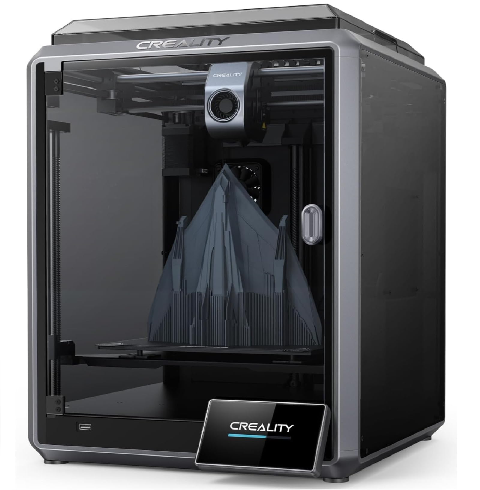 Il design è moderno e funzionale. La struttura completamente chiusa, con pannelli in policarbonato e una porta frontale in vetro, non solo le conferisce un aspetto professionale, ma è anche fondamentale per la stampa di materiali tecnici come l'ABS, che richiedono una temperatura controllata e stabile per evitare problemi di warping (deformazione). Il telaio CoreXY a vista contribuisce alla rigidità necessaria per gestire le alte velocità e accelerazioni.