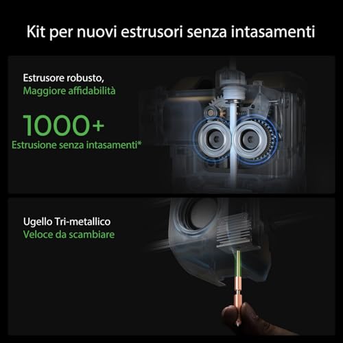 Estrusore e Hotend: La K1 è dotata di un estrusore Direct Drive a doppio ingranaggio e di un hotend con riscaldatore ceramico che raggiunge i 200°C in soli 40 secondi. Questa configurazione garantisce un'estrusione potente e costante, con un flusso massimo di 32mm³/s, e permette di stampare una vasta gamma di filamenti, dai classici PLA e PETG ai più ostici ABS, ASA e TPU, con temperature che arrivano fino a 300°C.