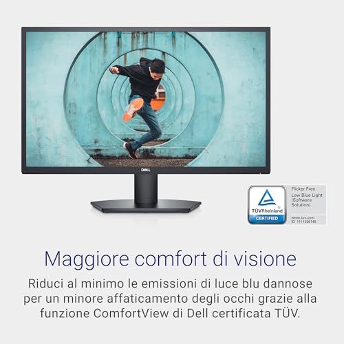 Dell ha posto grande attenzione al comfort visivo. Il SE2725HM è dotato della tecnologia ComfortView Plus, una soluzione hardware integrata che riduce le emissioni di luce blu dannosa senza compromettere l'accuratezza dei colori. A differenza delle soluzioni software che spesso conferiscono allo schermo una sgradevole dominante gialla, ComfortView Plus agisce a livello di pannello, preservando la qualità dell'immagine. Grazie a questa caratteristica e alla tecnologia anti-sfarfallio (Flicker-Free), il monitor ha ottenuto la certificazione TÜV Rheinland 3-star per il comfort visivo, uno standard che attesta la sua capacità di ridurre l'affaticamento degli occhi.