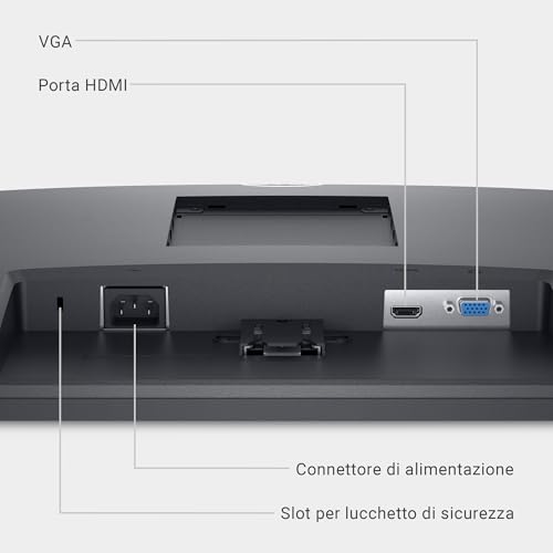 Sul retro, il Dell SE2725HM offre una connettività essenziale ma funzionale. Troviamo una porta HDMI 1.4 e una porta VGA. Questa scelta permette di collegare sia dispositivi moderni che PC più datati, garantendo una buona versatilità. Manca una porta DisplayPort o un hub USB, ma considerando la fascia di mercato del prodotto, è una rinuncia comprensibile. Il monitor è inoltre compatibile con lo standard VESA 100x100mm, consentendo di montarlo a parete o su un braccio ergonomico per una maggiore flessibilità di posizionamento. A livello di ergonomia, lo stand permette solo la regolazione dell'inclinazione; per altezza o rotazione, è necessario ricorrere a un supporto VESA.