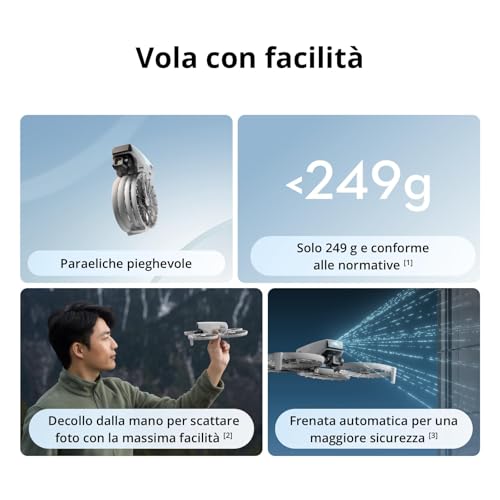 Il drone si accende automaticamente una volta aperti i bracci, pronto al decollo in pochi istanti. Una delle funzioni più innovative è la possibilità di farlo decollare e atterrare direttamente dal palmo della mano, utilizzando semplici gesti o comandi vocali tramite l'app, anche senza l'uso del radiocomando. Questa immediatezza lo rende perfetto per catturare momenti al volo, specialmente per vlogger e content creator che hanno bisogno di rapidità e semplicità d'uso.
