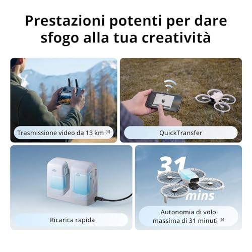 Il DJI Flip offre un'esperienza di volo intuitiva e adatta anche ai principianti. Con il radiocomando DJI RC2, incluso in alcune versioni, la portata del segnale video può raggiungere fino a 13 km (in modalità FCC), garantendo un controllo stabile e affidabile. L'autonomia di volo dichiarata è di circa 31 minuti, anche se nell'uso reale, come spesso accade, si attesta intorno ai 23-24 minuti per batteria, un risultato comunque buono per la sua categoria.