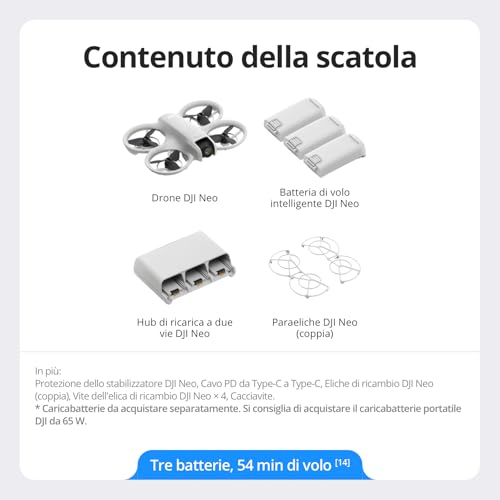 La versione DJI Neo Combo è senza dubbio la più consigliata. Oltre al drone, la confezione include accessori fondamentali per un'esperienza completa:
