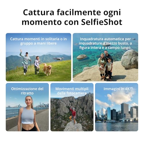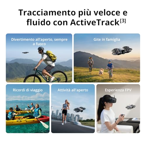Il DJI Neo è pensato per essere un cameraman personale. Le sue modalità di volo intelligenti sono il suo punto di forza. Offre un'ampia gamma di QuickShots (Dronie, Cerchio, Ascesa, ecc.) che permettono di creare clip dall'aspetto professionale con un semplice tocco. La funzione più interessante è sicuramente il tracciamento del soggetto (FocusTrack), basato su algoritmi di intelligenza artificiale. Il drone è in grado di seguire una persona in modo autonomo e affidabile, mantenendola sempre al centro dell'inquadratura, perfetto per riprendere attività come passeggiate, giri in bici o semplicemente per creare vlog dinamici.