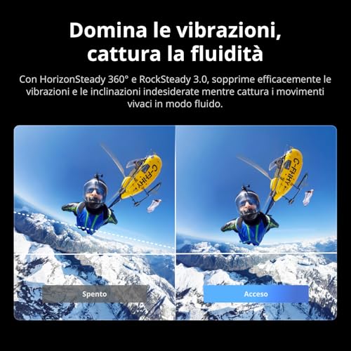 Se si vuole ancora di più, la modalità Boost Video spinge il campo visivo a 170 gradi, registrando in 4K a 120fps, ideale per slow motion fluidi e adrenalinici. In queste modalità, la stabilizzazione elettronica RockSteady 3.0 fa un lavoro eccellente nel ridurre vibrazioni e scossoni, restituendo immagini stabili e immersive. A questo si aggiunge la funzione HorizonSteady 360° che mantiene l'orizzonte sempre perfettamente livellato.