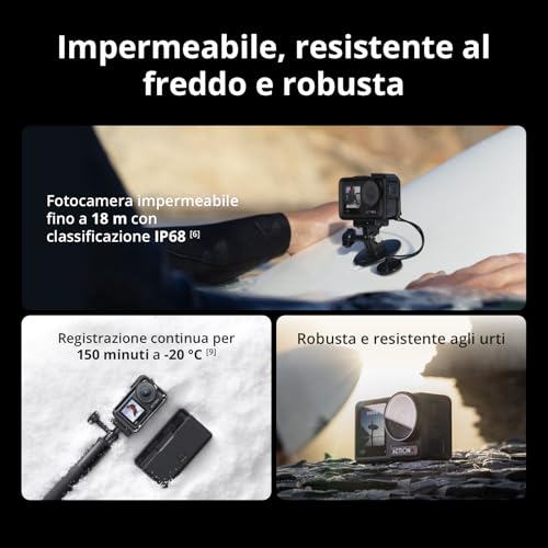 La robustezza è un altro punto a favore. L'Action 4 è progettata per resistere a condizioni estreme: è impermeabile fino a 18 metri senza bisogno di custodie aggiuntive e funziona senza problemi anche a temperature gelide, fino a -20°C. L'autonomia della batteria è solida, permettendo fino a 150 minuti di registrazione in condizioni ottimali, un dato di tutto rispetto per una action cam.