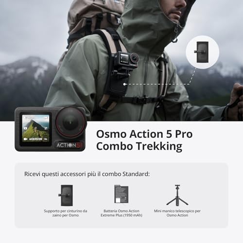 La versione "Pro Combo" che abbiamo testato, spesso chiamata "Adventure Combo" da alcuni rivenditori, arricchisce la dotazione di base. Oltre alla camera e agli accessori standard (batteria, cornice protettiva, supporti adesivi), solitamente include due batterie extra, una custodia di ricarica multifunzione capace di caricare tre batterie contemporaneamente e un'asta di prolunga da 1,5 metri, offrendo un pacchetto completo per chi non vuole porsi limiti.