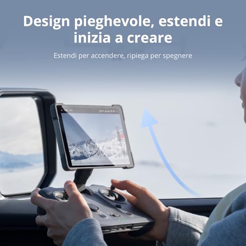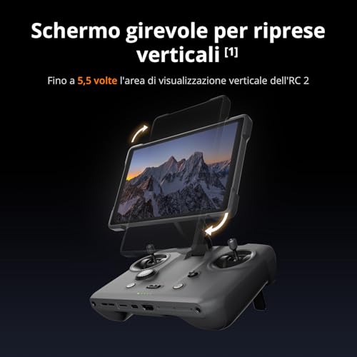 Ma la vera magia avviene con un semplice gesto: lo schermo è ruotabile. Questa non è una semplice finezza estetica, ma una funzione che cambia le regole del gioco per i content creator. Ruotando fisicamente lo schermo in verticale, il gimbal del drone si sincronizza istantaneamente, passando alla modalità di ripresa verticale. Questo permette di avere un'anteprima a schermo intero, fino a 5,5 volte più grande rispetto a quella che si avrebbe su un RC 2, perfetta per comporre con precisione le inquadrature destinate ai social media come Instagram Reels o TikTok.