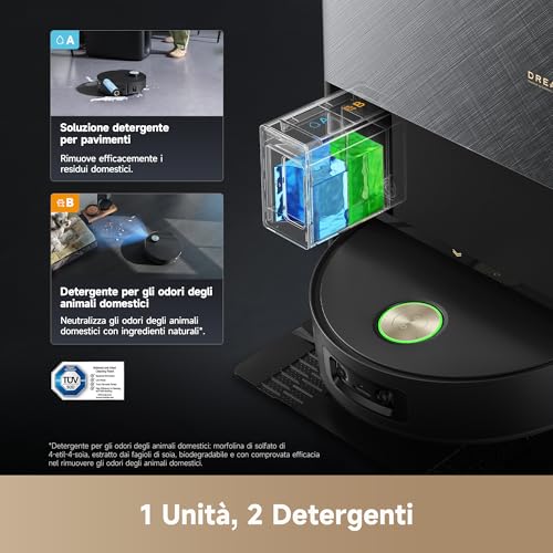 - Riempimento automatico dell'acqua: La base contiene due grandi serbatoi, uno per l'acqua pulita (4,5 litri) e uno per quella sporca (4 litri), e si occupa di riempire automaticamente il piccolo serbatoio interno del robot. In più, dosa in autonomia il detergente specifico.