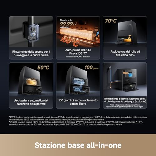 - Stazione base quasi completamente autonoma (svuota, lava, asciuga e pulisce)