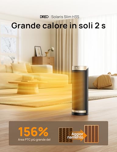 Ma veniamo al sodo: come riscalda? La tecnologia di riscaldamento in ceramica PTC (Positive Temperature Coefficient) è il cuore pulsante di questo termoventilatore. Il vantaggio principale è la rapidità: una volta acceso, il Dreo Solaris Slim H3 inizia a emettere un flusso d'aria calda in appena un paio di secondi. Questa caratteristica è perfetta per chi cerca un sollievo immediato dal freddo, senza dover attendere lunghi tempi di preriscaldamento. È ideale per ambienti fino a 25 metri quadrati.