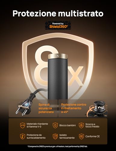 Quando si parla di dispositivi che generano calore, la sicurezza è fondamentale. Dreo ha equipaggiato il Solaris Slim H3 con tutte le protezioni necessarie. È dotato di un sensore di protezione dal surriscaldamento, che spegne automaticamente l'unità se la temperatura interna diventa troppo alta, e di un interruttore anti-ribaltamento, che interrompe immediatamente il funzionamento in caso di caduta accidentale. I materiali utilizzati sono inoltre ignifughi, offrendo un ulteriore livello di tranquillità.