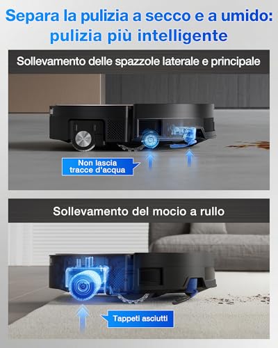 Il robot è anche intelligente: grazie a dei sensori, rileva il livello di sporco e può decidere autonomamente di effettuare una seconda passata dove necessario. Inoltre, quando incontra un tappeto, solleva automaticamente i mop di 15 mm per evitare di bagnarli e contaminarli, proseguendo con la sola aspirazione.