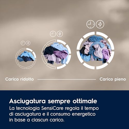 A questa si affianca la tecnologia SensiCare, un sistema intelligente che, grazie a specifici sensori, misura la temperatura e il livello di umidità all'interno del cestello. In base a questi dati, l'asciugatrice regola automaticamente la durata del ciclo e i consumi energetici. Questo non solo protegge i vestiti da un'asciugatura eccessiva, ma ti fa anche risparmiare tempo ed energia, ottimizzando ogni singolo ciclo in base al carico effettivo.