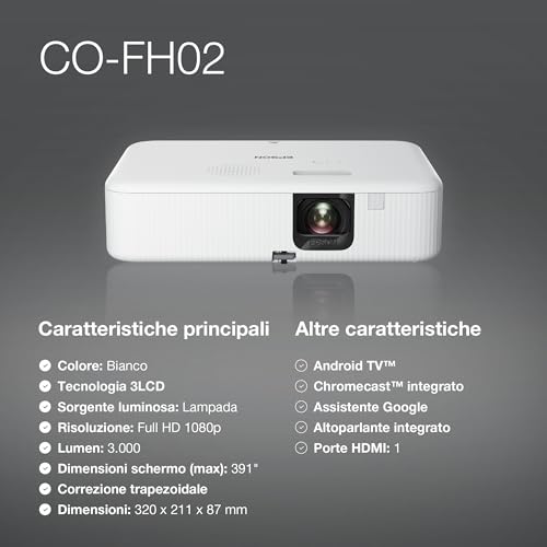 L'Epson CO-FH02 si presenta come un videoproiettore "crossover", pensato per essere tanto un compagno per l'intrattenimento domestico quanto uno strumento per l'ufficio o la didattica. Con la sua risoluzione nativa Full HD (1920x1080p), promette immagini nitide e dettagliate, capaci di trasformare il salotto in una vera e propria sala cinematografica. La sua caratteristica più sbandierata è senza dubbio l'incredibile luminosità: con 3.000 lumen dichiarati, questo proiettore non teme la luce e si propone come soluzione ideale anche per ambienti non completamente oscurati.