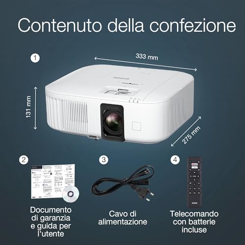 Appena tolto dalla scatola, l'Epson EH-TW6250 si presenta con un design classico e funzionale. Il suo chassis bianco lucido, dalle dimensioni di 34x13x28 cm e un peso di poco più di 4 kg, lo rende abbastanza compatto e facile da spostare, pur essendo un modello pensato principalmente per un'installazione fissa. La configurazione iniziale è sorprendentemente semplice e intuitiva, anche per chi non ha mai avuto a che fare con un videoproiettore.