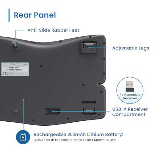 La Ewent EW3288 è alimentata da una batteria al litio ricaricabile da 300mAh. L'autonomia è buona e supportata da una funzione di risparmio energetico intelligente che mette la tastiera in stand-by dopo un breve periodo di inattività, prolungandone la durata. È presente anche un interruttore On/Off fisico per spegnerla completamente quando non viene utilizzata. La ricarica avviene tramite un cavo USB, incluso nella confezione.