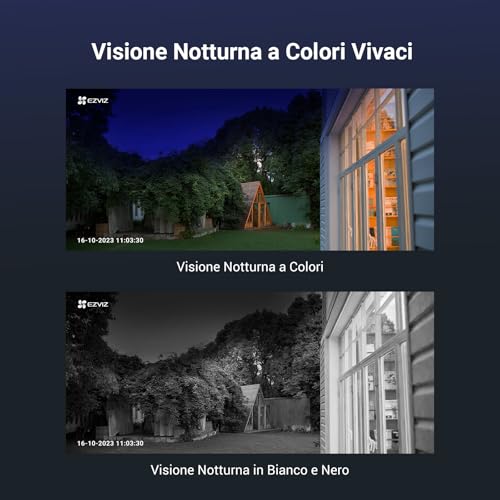 La EZVIZ BC1C è dotata di un sensore che registra video con una risoluzione Full HD 1080p (esiste anche una versione 2K/4MP). La qualità delle immagini diurne è ottima, con colori vividi e dettagli nitidi. Ma è di notte che questa telecamera sorprende. Grazie a due faretti LED integrati, offre una visione notturna a colori. Quando rileva un movimento al buio, i faretti si accendono, illuminando la scena e permettendo di registrare immagini a colori chiare e dettagliate, un vantaggio non da poco per identificare dettagli cruciali.