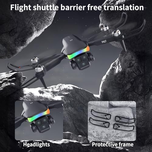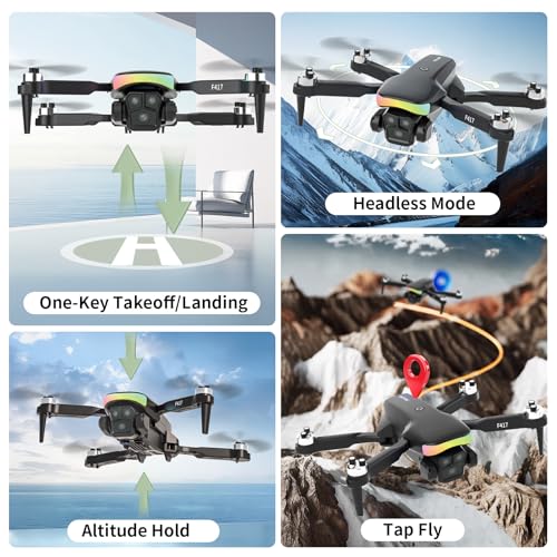 Il drone F417 è equipaggiato con una doppia telecamera. La fotocamera principale, frontale, viene spesso pubblicizzata con risoluzioni "4K" o "1080P HD". È importante però essere realistici: in questa fascia di prodotto, la qualità è sufficiente per un uso amatoriale e per divertirsi a scattare qualche foto o girare brevi video dall'alto, ma non è paragonabile a quella di droni professionali. La lente frontale può essere inclinata elettricamente tramite il radiocomando, solitamente fino a 90 gradi, offrendo una certa flessibilità nelle inquadrature.