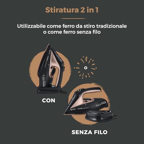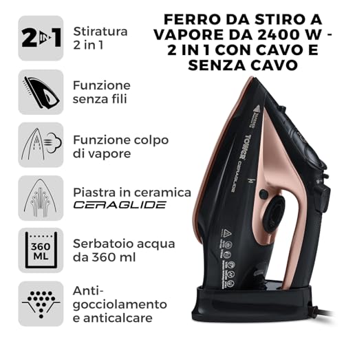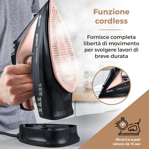 Una menzione speciale merita il modello Tower T22008, che offre una doppia modalità d'uso: con cavo, per le lunghe sessioni di stiro, e senza filo per la massima libertà di movimento. La base di ricarica riscalda il ferro in soli 30 secondi, garantendo un'autonomia di circa 35 secondi in modalità cordless, ideale per ritocchi veloci o per stirare capi ingombranti senza l'intralcio del filo.