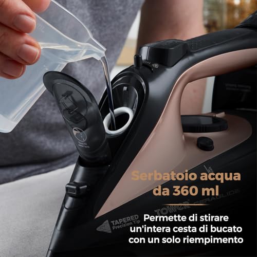Un dettaglio apprezzabile è la punta di precisione, progettata per raggiungere facilmente le zone più difficili come i colletti delle camicie, i polsini e lo spazio tra i bottoni. Anche la capacità dei serbatoi d'acqua è un punto a favore: il modello T22013, ad esempio, vanta un serbatoio da 360ml, mentre il generatore di vapore T22023GLD arriva a ben 1,2 litri, riducendo la necessità di frequenti rabbocchi.