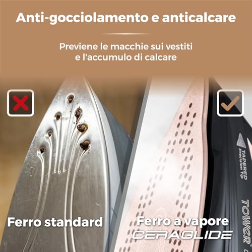 Oltre alle prestazioni pure, la linea Tower CeraGlide integra una serie di funzionalità pensate per semplificare la vita e garantire la longevità del prodotto. Tra queste, spiccano i sistemi anti-goccia, che evitano la fuoriuscita di acqua e la conseguente formazione di macchie sui vestiti, e le funzioni autopulenti e anti-calcare, che prevengono l'accumulo di calcare e mantengono la piastra e gli ugelli del vapore sempre efficienti.