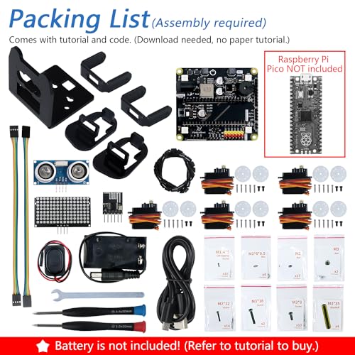 All'interno della confezione troverai tutto il necessario per l'assemblaggio del robot, ad eccezione di un paio di elementi cruciali. Il kit include la scheda di controllo, i servomotori per il movimento, un sensore a ultrasuoni per il rilevamento degli ostacoli, una matrice LED per dare "espressioni" al robot, un altoparlante, un cicalino e persino un telecomando a infrarossi. A seconda del pacchetto acquistato, la scheda Raspberry Pi Pico o Pico W potrebbe essere inclusa o meno.