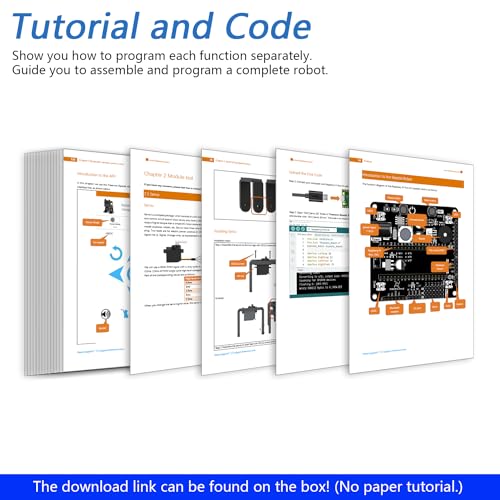 La vera forza di questo kit, però, risiede nell'approccio didattico. Il tutorial fornito (scaricabile online, non è presente una versione cartacea) non si limita a guidarti nell'assemblaggio del robot. Ogni componente, dai servomotori al sensore a ultrasuoni, viene prima presentato singolarmente. Questo significa che prima di costruire il robot completo, imparerai come funzionano e come programmare un servo, un cicalino, un altoparlante per file MP3, una matrice LED e molto altro. È un percorso di apprendimento completo che ti lascia con competenze reali e non solo con un robot montato.